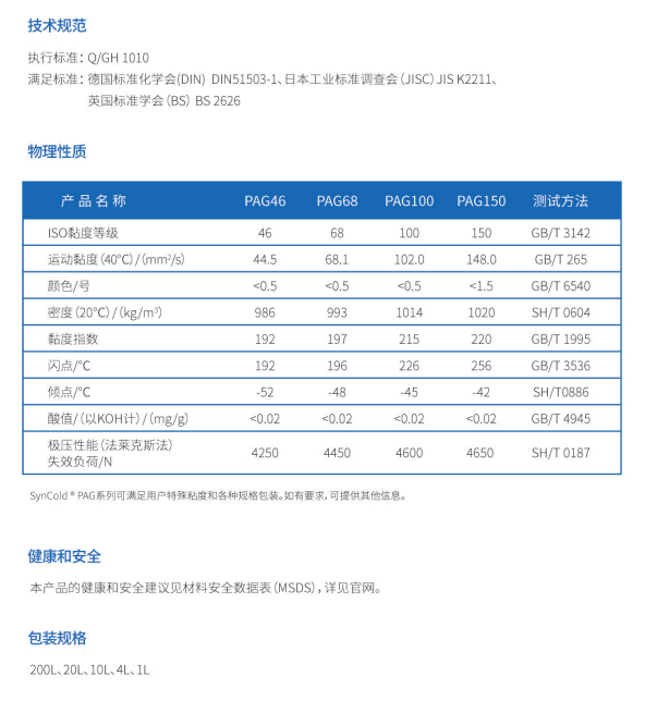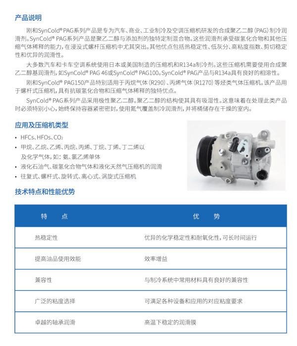 ■ ■ ■剛和SynCold?PAG系列產(chǎn)品是專為汽車、商業(yè)、工業(yè)制冷及空調(diào)壓縮機(jī)研發(fā)的合成聚乙二醇(PAG)制冷潤滑劑。SynCold?PAG系列產(chǎn)品是聚乙二醇與添加劑的獨(dú)特定制混合物。這些潤滑劑承受碳?xì)浠衔锖推渌麎嚎s氣體稀釋的能力,在浸沒式螺桿壓縮機(jī)中尤其突出。其他優(yōu)點(diǎn)包括熱穩(wěn)定性、低灰分、高粘度指數(shù)、剪切穩(wěn)定性和優(yōu)異的潤滑性。